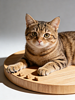 不经意间拍摄的,自然的光线,主角是图片中的这只猫,晚上,在巴黎卢浮宫前,抬起一只爪子拿着手抓饼。生成的图片中的猫尽可能和原图中的猫保持一致,这只猫咪可以表现的开心些。