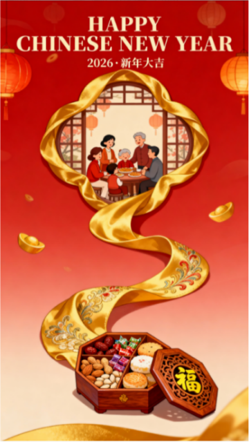 手绘插画风格。底部是一个小小的精美木质雕花点心盒,盒盖上有金色的"福"字,盒内装满各种坚果、糖果和传统糕点。从点心盒呈S形曲线向上延伸出一条金色刺绣绸缎,丝绸汇聚成顶部的大花窗,整个花窗边缘被金色绸缎覆盖,并继续向画面上方延伸。花窗的中间是家庭团聚场景,浓郁的新年氛围。画面上方大字主标“HAPPY CHINESE NEW YEAR”“2026·新年大吉”。红色渐变背景,点缀灯笼、元宝元素。