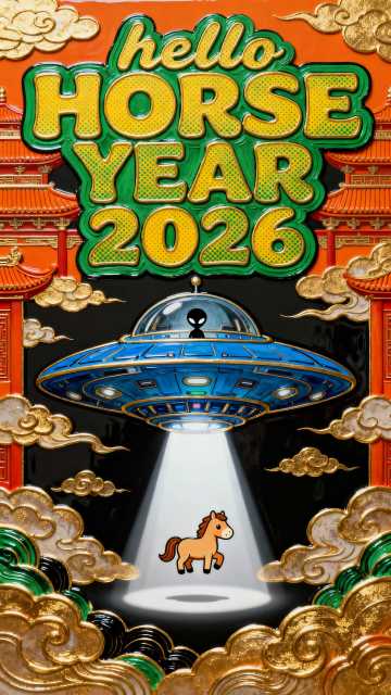 顶部巨大英文单词 “hello HORSE YEAR 2026”,字体为复古漫画风格(笔画填充黄底并带有细密绿色网点纹理,边缘包裹粗重的绿色描边,笔画饱满且边角呈卡通化圆润形态,变形包裹着UFO),画面中心是一艘巨大的蓝色圆盘状UFO(驾驶舱内有一个小的外星人剪影),底部发出耀眼的白色光束,光束中悬浮着一只可爱的马。背景是橙红色的中式建筑和云层。整个画面为橙、绿、黑撞色