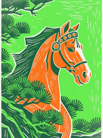 主体是带有戏曲头饰的橙色马头,搭配青松元素,以荧光绿底纹为背景基底;构图以马为视觉核心