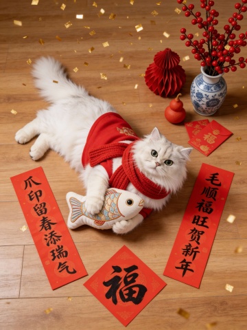 70年代影楼风格写真,微噪点感,两只拟人化装扮的宠物趴在米色毛绒地毯上:左边为宠物参考图1,戴粉色蕾丝褶皱发带,穿同色系蓬松婴儿裙,眼神呆萌;右边为宠物参考图2,戴红色圆顶婴儿帽,穿红色包屁衣(胸口有黄色小装饰),表情懵懂。背景是粉紫渐变柔光底色,点缀金色星星、黄色小花装饰,右上角有红黄蓝渐变的中式“龙凤宝宝”艺术字。地毯上散落着橙色橘子摆件、绿色小恐龙玩具、蓝色卡通玩偶,整体色彩饱和度极高,画风甜腻喜庆,呈现出“土甜可爱”的怀旧喜庆氛围。