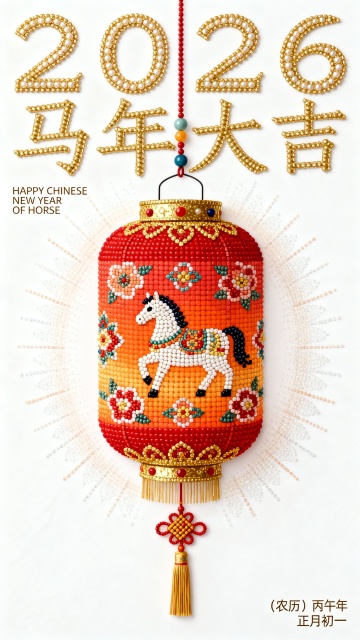 主体是红到橙渐变的圆柱形中式灯笼(表面饰有小马和宝相花纹图案),顶部配挂环与装饰珠,底部带金色饰边、中国结装饰及流苏,周围环绕柔和光晕。上下留白,左右留白,不要撑满整个画面。色调为纯白背景+ 红到橙渐变。画面上方有极细字体"2026""马年大吉",左下方小字“HAPPY CHINESE NEW YEAR OF HORSE” ,右下方小字“(农历)丙午年 正月初一”