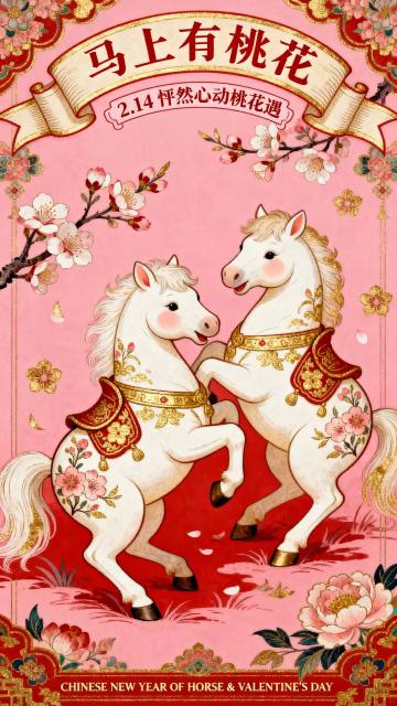 以2只胖嘟嘟的白色 唐代小马驹 玩耍的形象作为视觉中心(装饰桃花纹路的金纹和中式马鞍),强动态感构图,搭配桃花、花卉装饰元素。顶部结合桃花枝设计”马上有桃花“的弯曲变形字标题+卷轴样式线框的文案"2.14 怦然心动桃花遇,"底部设精致的小字 “CHINESE NEW YEAR OF HORSE & VALENTINE'S DAY" 。色彩以红、金为主,粉色背景。