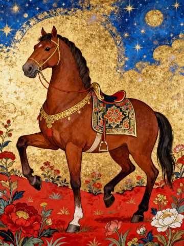 复古风格,特写一匹棕色唐马(中式花纹的马鞍)扬蹄在红色调的花园中的定格瞬间,背景蓝+金的西方星空
