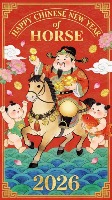 以正红为底色画面主体是身着华丽红金吉服的财神骑棕马,占画面三分之二的位置,旁伴持锦鲤的孩童,点缀灯笼、元宝、祥云、梅花等吉祥元素,上方有 “马年大吉”“2026”“HAPPY NEW YEAR” 字样,左右侧配 “新年快乐”,整体喜庆热闹,传递马年招财纳福的新春祈愿。