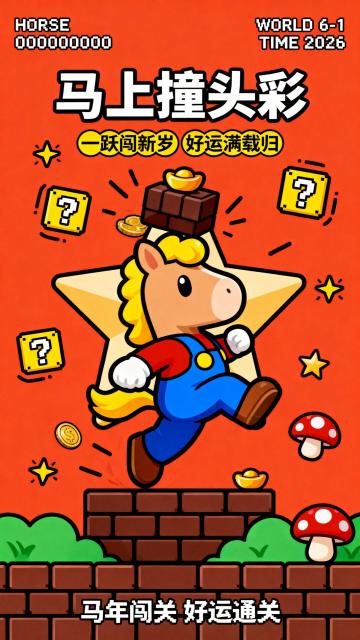 纯扁平风,随意的线条,抖动黑色描边画,橙红色背景,底部是深棕色砖块平台与绿色草地,浅棕色拟人小马,有着黄色马鬃,穿马里奥同款红蓝黄配色服装,跳跃闯关姿态,头顶撞上深棕色方块砖与元宝,马背后是一个大星星底衬,周围环绕黄色问号方块、金币、星星、红色蘑菇元素。 文案排版为:顶部左侧是白色像素字体 “MARIO” 与数字 “00000000”,右侧是 “WORLD 6-1” 与 “TIME 2026”;中间是白色可爱粗体主标题 「马上撞头彩」;主标题下方是黄色圆润小字副标题「一跃闯新岁 好运满载归」,呼应小马跳跃闯关的视觉;底部是一行白色像素字体「马年闯关 好运通关」