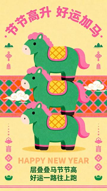 新中式,纯扁平风,暖黄底色搭配绿粉橙撞色。中心对称构图,主体是 3 匹绿滚圆胖萌骏马垂直堆叠(粉鬃毛),马外轮廓有粉色描边,黄菱格鞍垫。画面中部背景是中国风粉绿橙菱形花纹装饰带,点缀圆润的白色祥云与蓝绿的远山。画面顶部是弧形排列的主标题 “节节高升 好运加马”,采用粉色可爱字体。底部文字:上方是浅橙色调的字 “HAPPY NEW YEAR”,画面下方是深绿色字“层层叠叠步步高好运加马一路飙”,并在画面底部添加一条细窄的粉色装饰线,画面点缀小装饰元素(粉绿钱币、元宝、国风图形,线条,左右对称)