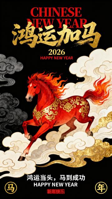 国潮浮世绘风格马年主题插画,纯黑背景,主体为一匹通体赤红的骏马呈奔腾姿态,鬃毛与尾毛化为橙红渐变的火焰状纹理,马身装饰繁复的金色传统缠枝花纹与云纹纹样,周围环绕层次丰富的米白、浅金祥云图案,左侧点缀深灰云纹,整体采用高对比度的红、金、黑配色,以细腻的日式浮世绘线条勾勒,营造出热烈磅礴、充满力量感的视觉效果,适合作为马年春节的开运主题装饰画。文字排版为:顶部是红色大写英文字体 “CHINESE NEW YEAR”,叠加金色书法主标题 “鸿运加马”,字体笔触粗犷有力,下方标注 “2026” 与红色小字 “HAPPY NEW YEAR”;底部居中是白色副标题 “鸿运当头,马到成功”,其下方为白色英文字体 “HAPPY NEW YEAR”;左下角有金色圆形 “马” 字标识,右下角有金色圆形 “年” 字标识,底部中央点缀 “新年快乐” 红色印章,整体风格大气热烈,寓意马年鸿运连连、万事顺遂。