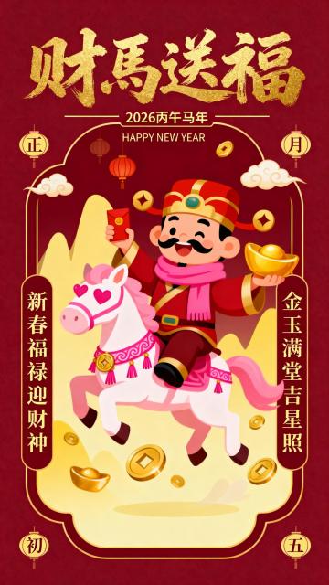 拟人的马,和人一样双脚站立,正面,童趣手绘风格新年插画,平涂色彩,以高饱和度正红色为背景,点缀祥云纹样与钱币图案,画面主体是两只叠放的Q版拟人的马,下方是体型较大的橙色拟人马,搭配深蓝色的鬃毛,大笑,红白黄色新年衣服装饰有黄色 吉祥纹样,举着上方的马;上方是一只浅棕色的拟人马,双手拿着福字,搭配米白色的鬃毛,吐舌头,穿红白黄新年服装有国风纹样,顶部是可爱的白色艺术字体主标题「福气加马」,中间一行加浅黄色艺术字副标题 “2026 HAPPY NEW YEAR”,最上方上方还有弧形排列的小字 “BLESSINGS IN THE YEAR OF THE HORSE”。画面左右两侧是竖排米色小字吉祥语:“双马送喜 福气加倍” 与 “马年行运 福满四季”(左右竖排文字中间各点缀一个灯笼图形)。底部一行浅黄很小字是 “马马相伴 福福相随 2026 好运开道”