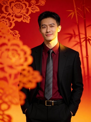 酒红色西装新年单手插兜形象照