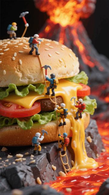 汉堡包外壁上攀爬着微型探险者,岩浆背景