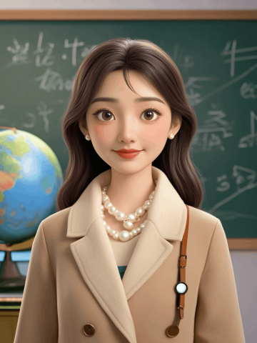 迪士尼风格,3D角色,一名20多岁的中国女教师,五官精致,背景有地球仪,黑板