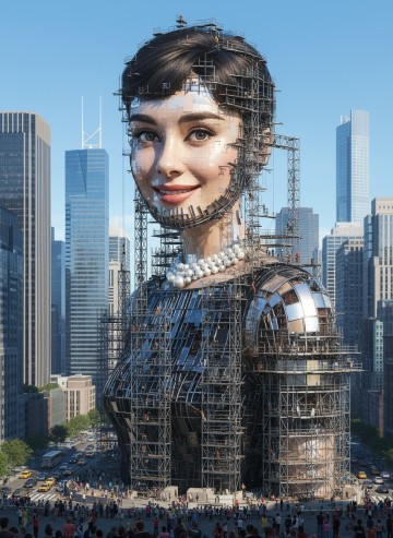 上传图中的人物主体,化身为现代城市中正在建设的巨型艺术雕塑装置。该巨型人物周围环绕着大面积脚手架,背景是澄澈蓝天与细节丰富的城市景观(包含街道、建筑、车辆,以及底座周围的渺小人群),整体画面超细节呈现,兼具真实纹理质感与超现实巨型艺术品美学风格。