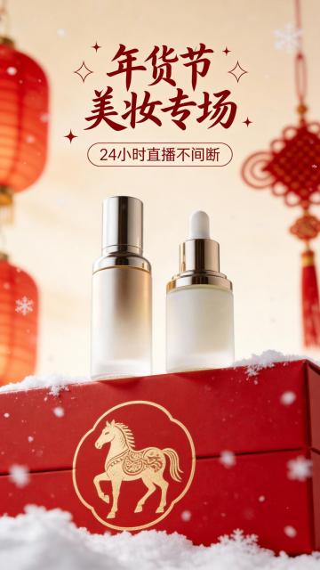 年货节商品玩法|喜庆感美容美妆舞台表彰商品创意海报