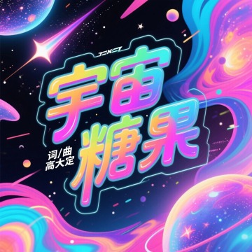 专辑封面设计,标题居中主标题“宇宙糖果”,副标题小字“词/曲 高大定”,Y2K风格,未来感氛围