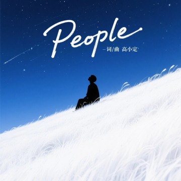专辑封面设计,手写字体主标题文案“People”+副标题“词/曲 高小定”,一个剪影小人的坐在斜面的山坡上,白色的草地,仰望深蓝的星空,氛围治愈