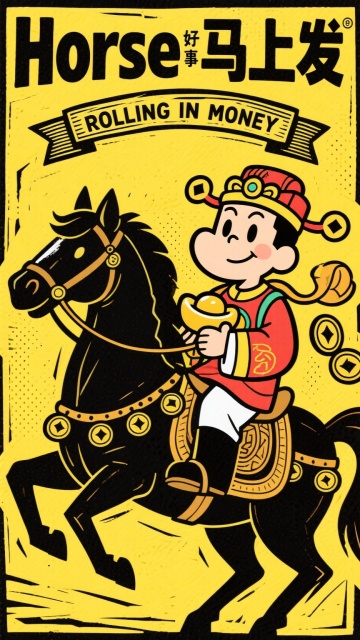 以正红为底色画面主体是身着华丽红金吉服的财神骑棕马,占画面三分之二的位置,旁伴持锦鲤的孩童,点缀灯笼、元宝、祥云、梅花等吉祥元素,上方有 “马年大吉”“2026”“HAPPY NEW YEAR” 字样,左右侧配 “新年快乐”,整体喜庆热闹,传递马年招财纳福的新春祈愿。
