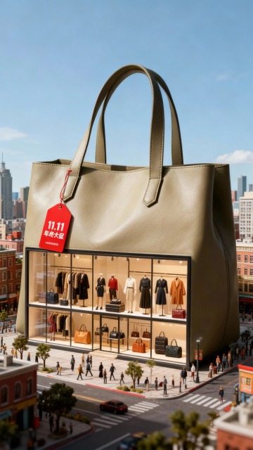 视觉中心为图中主体巨大化,主体内部设计成橱窗形式,展示着服饰箱包,皮包上挂着红色吊卡“11.11 年终大促”,背景为城市街区微缩景观。