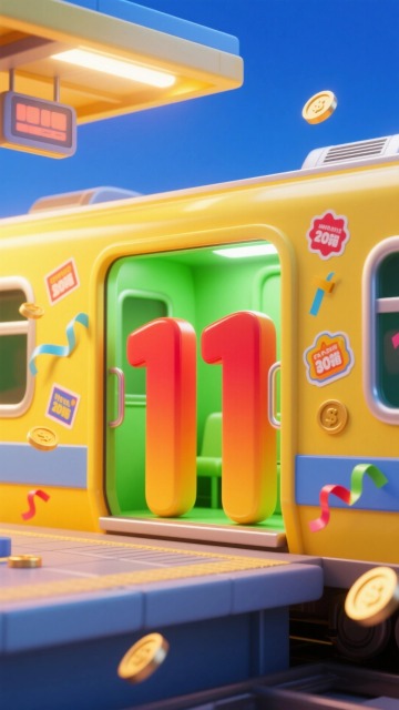 立体数字“11”(红橙渐变)立在荧光绿的车厢里的特写,车厢壁贴满写着促销信息的潮流贴纸,彩带和金币漂浮,视角为从黄色站台看向打开的车厢门,整体呈现黄色调+多彩的撞色配色方案,蓝色背景,促销氛围,辉光