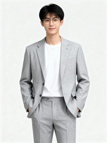 保留人物脸型、发型、年龄特征生成职场形象照,正脸照;人物居中, 消除痘印,肤质优化处理提亮肤色,均匀肤色,干净的男士淡妆,气色自然,无明显浓妆痕迹; 身穿浅灰色商务西装套装,白色T恤内搭,休闲风穿搭; 双手插兜的姿态,肢体自然,站立姿势,从容干练,臀部以上半身像,人物居中,表情动作自然,嘴角上扬,内敛,眼神坚定直视镜头,表情沉稳淡然; 专业人像摄影,淡妆,柔和自然打光,画质清晰,头部完整,高清棚拍专业摄影人像写真,去除人物之外的所有元素,50mm标准焦段,F/4光圈(F/2.8-F/4区间),相机与人物距离3米,横向16:9比例(左右预留环境空间),人物占画面60%,入镜头部至膝盖上方5cm,平视视角,人物居中构图,头肩比例协调,超高清肤质,细腻毛孔纹理,8K,超高分辨率,简约浅灰色纯色背景。