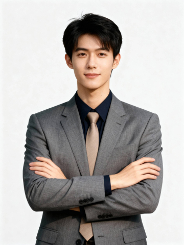 保留人物脸型、发型、年龄特征生成职场形象照,正脸照;人物居中, 消除痘印,肤质优化处理提亮肤色,均匀肤色,干净的男士淡妆,气色自然,无明显浓妆痕迹; 身穿灰色商务西装套装,深色衬衣,发梢规整,浅咖色领带,西装剪裁合身,双臂交叉于胸前,肢体姿态舒展规整,传递出自信沉稳的气场, 站立姿势,臀部以上半身像,表情动作自然,眼神坚定直视镜头,嘴角上扬,表情沉稳淡然; 专业人像摄影,淡妆,柔和自然打光,画质清晰,头部完整,高清棚拍专业摄影人像写真,去除人物之外的所有元素,50mm标准焦段,F/4光圈(F/2.8-F/4区间),相机与人物距离2米,横向16:9比例(左右预留环境空间),人物占画面60%,入镜头部至膝盖上方5cm,平视视角,头肩比例协调,超高清肤质,细腻毛孔纹理,8K,超高分辨率,简约浅灰色纯色背景。