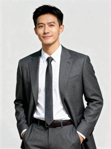 保留人物脸型、发型、年龄特征生成职场形象照,正脸照;人物居中, 消除痘印,肤质优化处理提亮肤色,均匀肤色,干净的男士淡妆,气色自然,无明显浓妆痕迹; 身着高级灰色西装西裤,内搭白色衬衫,搭配深灰色领带,暗色皮带; 双手插兜的姿态,站立姿势,肢体自信自然, 臀部以上半身像,表情动作自然,眼神坚定直视镜头,嘴角上扬,温柔,表情沉稳淡然; 专业人像摄影,淡妆,柔和自然打光,画质清晰,头部完整,高清棚拍专业摄影人像写真,去除人物之外的所有元素,50mm标准焦段,F/4光圈(F/2.8-F/4区间),相机与人物距离2米,横向16:9比例(左右预留环境空间),人物占画面60%,入镜头部至膝盖上方5cm,平视视角,头肩比例协调,超高清肤质,细腻毛孔纹理,8K,超高分辨率,简约浅灰色纯色背景。