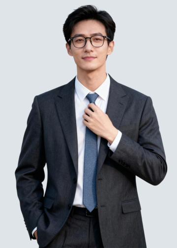 保留人物脸型、发型、年龄特征生成职场形象照,正脸照;人物居中, 消除痘印,肤质优化处理提亮肤色,均匀肤色,干净的男士淡妆,气色自然,无明显浓妆痕迹; 身穿暗灰色西装西裤,白色衬衣,灰蓝色领带,暗色皮带,西装剪裁合身,面料挺括, 一手轻调整领带,另一手插于裤兜,站立姿态, 臀部以上半身像,表情动作自然,眼神坚定直视镜头,表情沉稳淡然; 专业人像摄影,淡妆,柔和自然打光,画质清晰,头部完整,高清棚拍专业摄影人像写真,去除人物之外的所有元素,50mm标准焦段,F/4光圈(F/2.8-F/4区间),相机与人物距离2米,横向16:9比例(左右预留环境空间),人物占画面60%,入镜头部至膝盖上方20cm,平视视角,头肩比例协调,超高清肤质,细腻毛孔纹理,8K,超高分辨率,简约浅灰色纯色背景。