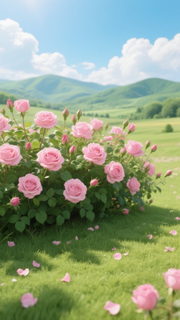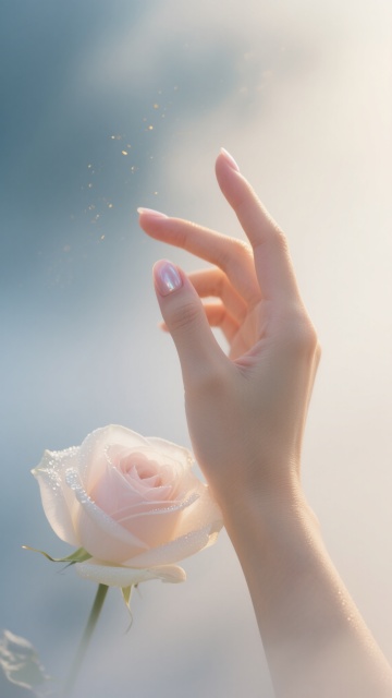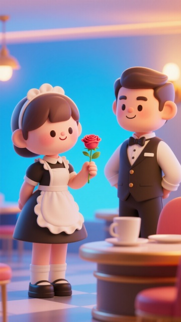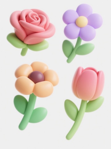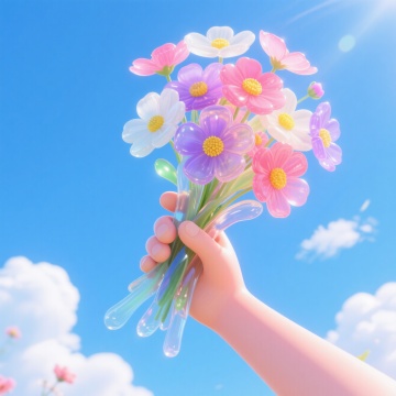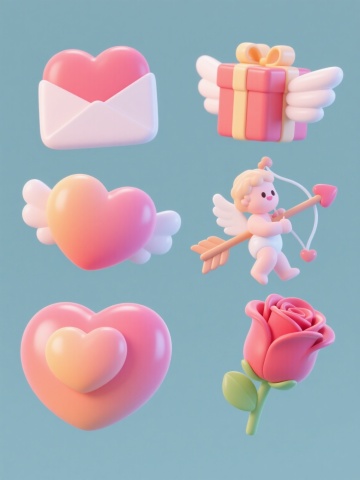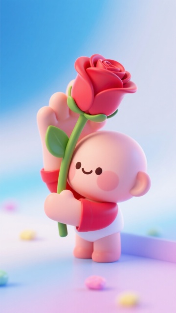 梦幻感十足的软3D风设计,卡通手握玫瑰,色彩渐变背景,营造浪漫氛围。