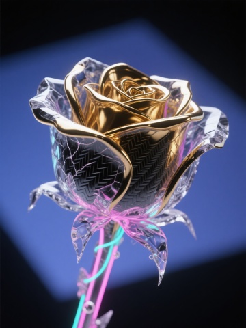 4. 侧逆光角度,霓虹灯材质的玫瑰在暗紫色背景中发光,单线条化作流动的霓虹灯管,粉色与青色的光芒在花瓣交汇处形成渐变光晕,线条末端带有灯管特有的电极光斑,呈现赛博朋克式的迷离美感。