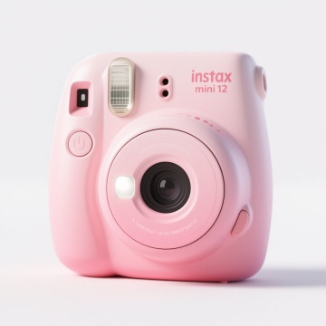 一个粉色渐变的instax mini 12拍立得相机,具有圆润的机身设计,正面有圆形的镜头和闪光灯,顶部有快门按钮和取景器,白色背景,3D渲染风格,高细节,光滑的塑料质感,柔和的光影效果,立体感强,简约时尚。