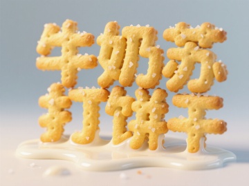 一个用饼干做成的“牛奶苏打饼干”大字,饼干呈金黄色,表面撒有细砂盐,下面流着牛奶的味道