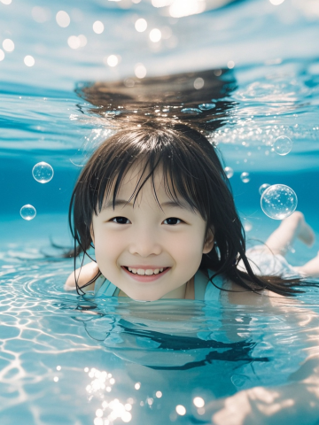 水下梦幻场景,女孩笑容可爱,泡泡环绕,清新实景感,夏日清凉氛围。