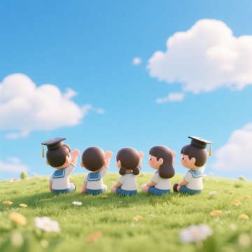 清新软3D风,卡通毕业生在蓝天白云下挥手告别,充满青春与希望。