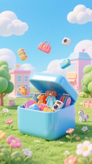 梦幻感十足的软3D风格插画,可爱卡通女孩在发光字母小径上跳跃,融合音乐、绘画元素,营造童趣微缩艺术世界,节日氛围温馨治愈。