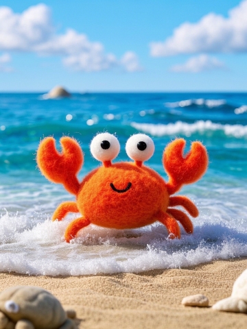 可爱卡通螃蟹,拟人化设计,清新柔软风,海边欢乐场景。