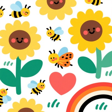 卡通插画风,拟人化蜜蜂形象,色彩鲜艳,可爱感十足,适合儿童节日设计。