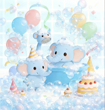 3D卡通风格,拟人化可爱大象家族,清新自然背景,生动活泼。