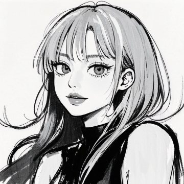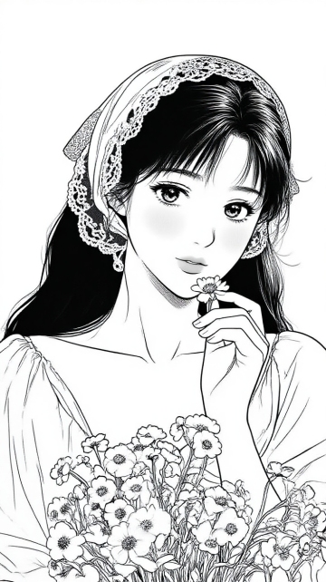 古典优雅的白描风漫画,少女手持花束,文艺气息浓厚。