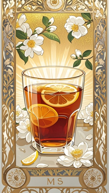 复古穆夏风,唯美鎏金设计,茶饮与花卉交织,尽显优雅浪漫。