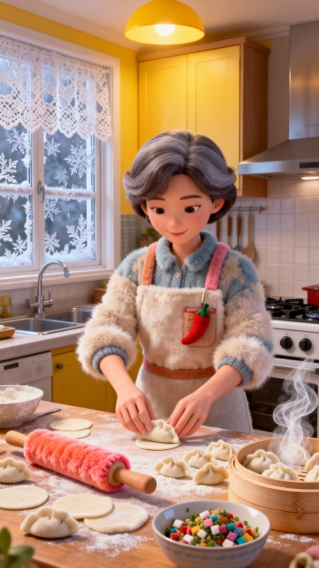 软3D风温馨厨房,毛发生长质感围裙与面粉飘散的细节,重拟物风格展现冬日包饺子场景,卡通感十足,节日氛围浓厚。