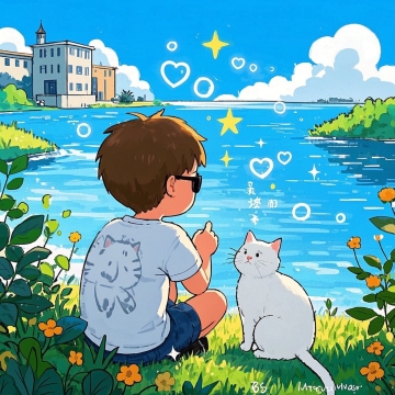 插画风的可爱场景,卡通人物与猫咪共同钓鱼,色彩鲜艳,充满童趣。