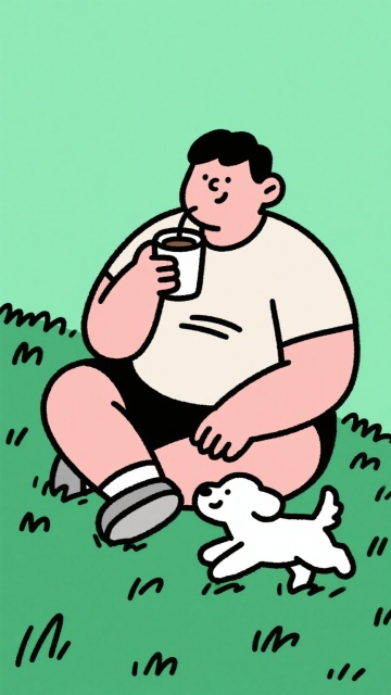 一个女孩女孩正坐在草坪上喝咖啡,简单的图形特征,肉肉可爱的四肢,在绿色的草地上,简单可爱的动作,诙谐可爱,可爱的小白狗在旁边运动,简单的图形,高饱和度的颜色,韩国插图,粗线条的笔触,头像设计