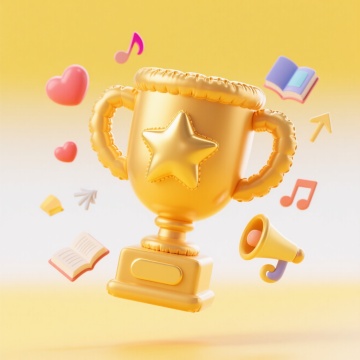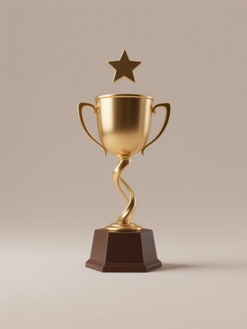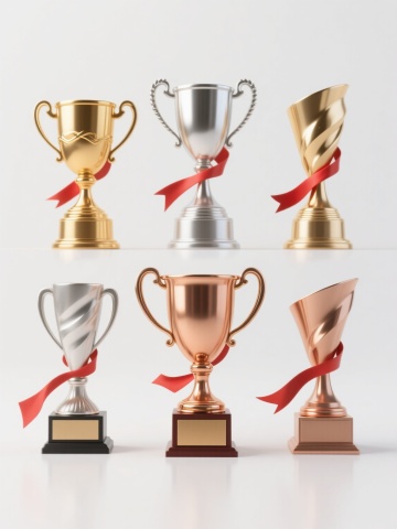 一套6张系列素材集合,每张均为简约现代风格的单一元素图案,规整排布。保持与原图一致的3D渲染质感,金色金属材质,光滑表面带有细腻高光和阴影,纯色背景。第一张:带有五角星浮雕的双耳奖杯,杯身圆润,底座有菱形纹路;第二张:简约线条设计的单耳流线型奖杯,杯口呈倾斜角度,底座为圆形;第三张:多层阶梯式底座的高脚杯造型奖杯,杯身两侧有对称弧形装饰;第四张:带有环形握手设计的方形杯身奖杯,表面有横向条纹肌理;第五张:顶部带有月桂叶环绕装饰的古典风格奖杯,底座为六边形;第六张:几何切割面构成的现代感奖杯,杯身有三角形镂空设计,整体棱角分明。所有奖杯均居中放置,保持统一的光影效果和视觉比重,强调金属的光泽感和立体感。