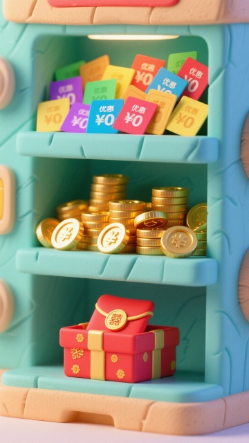 软3D风格的卡通收纳柜,内含多彩优惠券、金光闪闪的硬币与红色礼盒,拟人化设计充满可爱感与喜庆氛围,塑料质感增强视觉趣味。