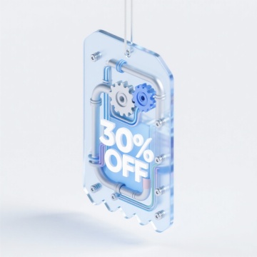 未来感3D标签,透明玻璃风结合金属管道与齿轮,科技工业美学展现30% OFF促销信息。