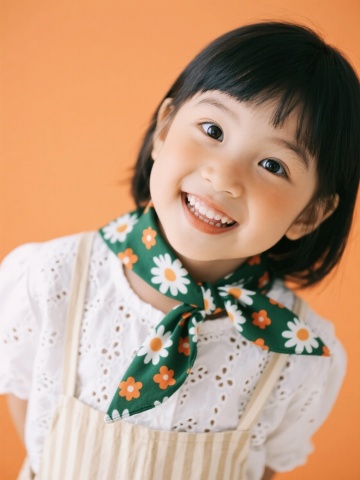 明亮的纯橙色背景,一个穿着白色镂空花纹衬衫和米色条纹背带裙的小女孩,脖子上系着一条绿色底印有白色雏菊和橙色小花图案的丝巾,她微微歪着头,睁大眼睛,嘴角上扬,露出开心的笑容,眼神中带着一丝俏皮和好奇,整体画面色彩明快,光线柔和,人物表情生动自然,具有清晰的肖像摄影风格。