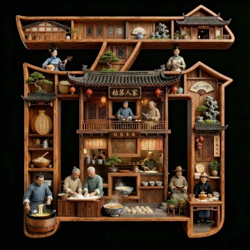 中式感卡通厨师,微缩艺术风展现热闹街市,生动趣味。