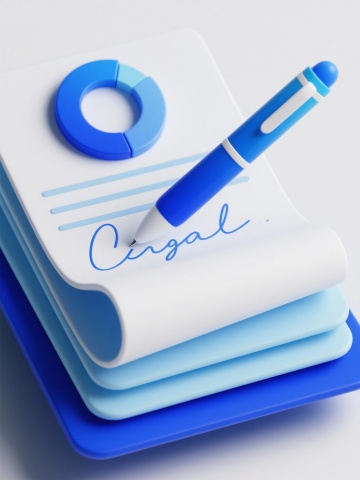 现代感3D轻拟物设计,蓝白配色凸显科技与商务气质,塑料质感强化体积感,笔触流畅呈现签署瞬间。