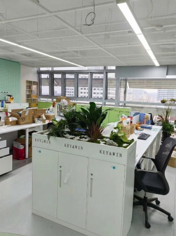 明亮现代的开放式办公室,专业商务人士正在办公桌前专注工作,配备电脑、办公文具和文件,玻璃隔断墙划分空间,白色天花板嵌入方形LED平板灯提供充足照明,灰色地毯地面,角落摆放大型绿植增添生机,整体色调以白色、灰色和蓝色为主,呈现简洁高效、专业有序的职场氛围,不同环境和角度下的办公室背景,光线明亮柔和,空间通透,办公家具现代简约,员工穿着统一深色工装,展现团队协作的工作场景。