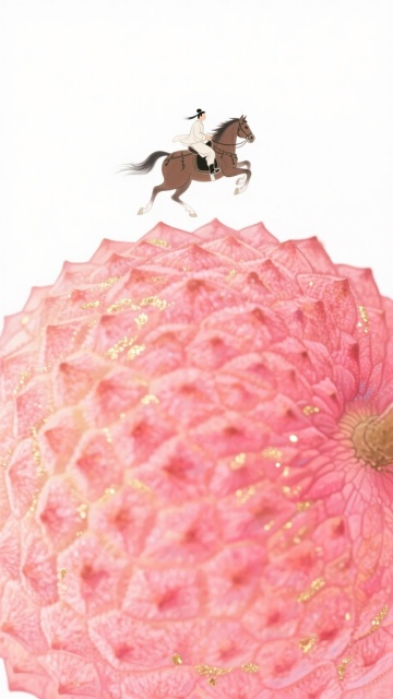 一幅新中式工笔插画,以简洁浅白为底色。上方是一位微缩的小人骑马飞奔,下方是一个巨大的荔枝,画面中,巨大荔枝呈现饱满的红粉色,表面纹理细腻,金色碎光点缀其旁增添华丽感。整体色彩搭配清新雅致又不失华贵,借古典意象与细腻笔触,营造出浪漫且富有东方意境的画面